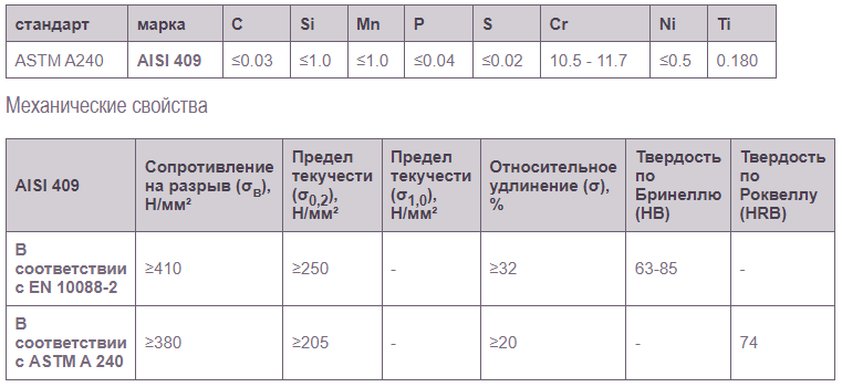 Сталь AISI 409 не упрочняется термообработкой и обладает хорошей стойкостью к образованию окалины вплоть до 700°C, сохраняя свои полезные эксплуатационные механические свойства до высоких температур.